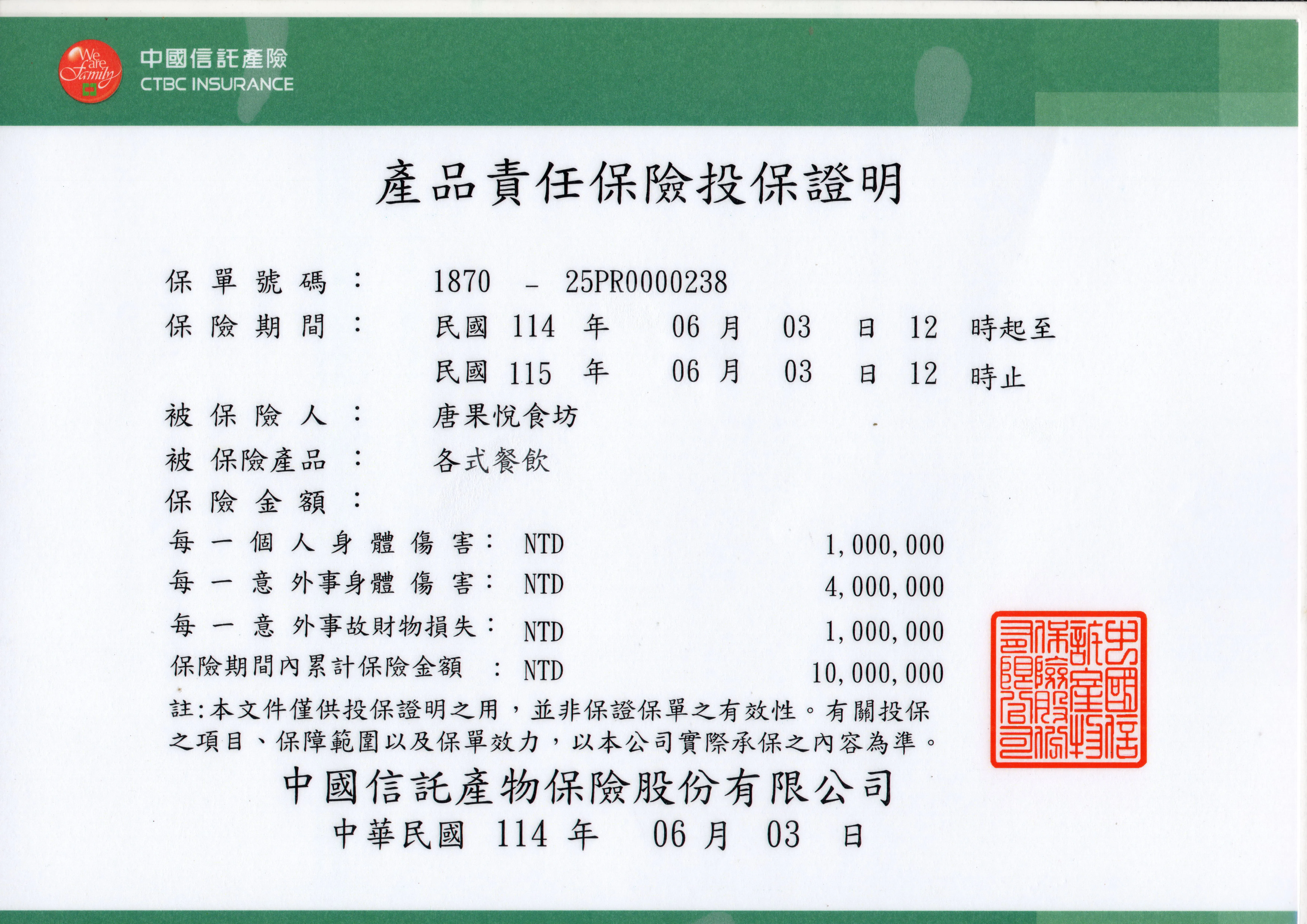 在唐果悅食坊,我們始終把顧客的健康與安心放在第一位。為了讓每一位顧客能夠更加放心地享用我們的餐點,我們特別投保了 「產品責任險」,由 中國信託產物保險股份有限公司 承保。